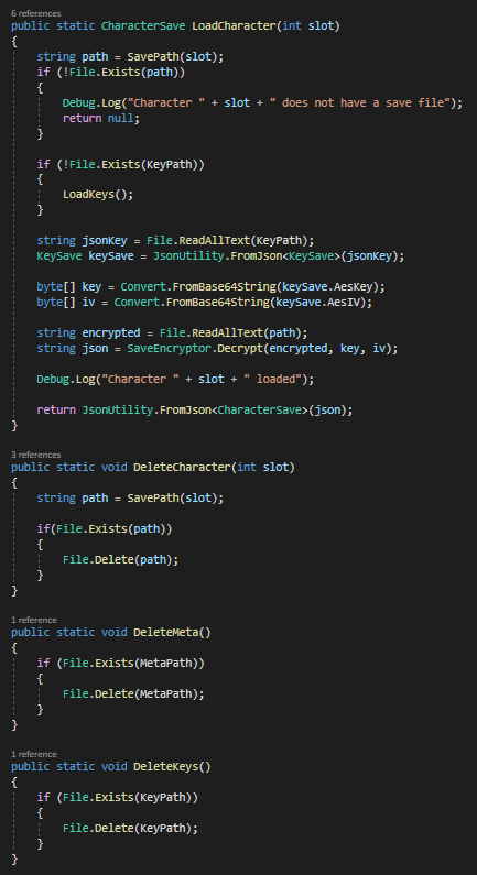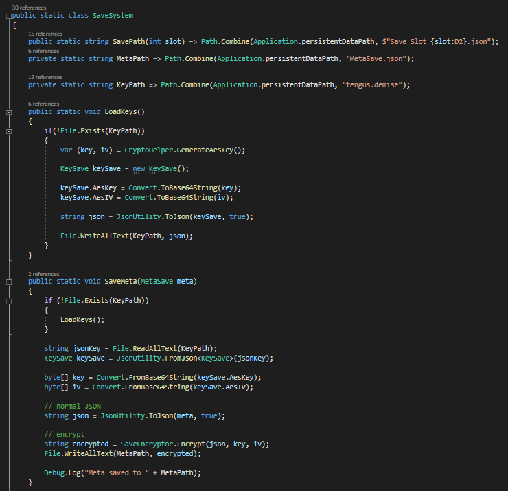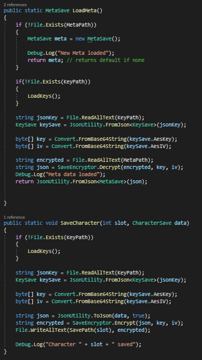 csharpFile.WriteAllText(MetaPath, json);return JsonUtility.FromJson<MetaSave>(json);I started by creating a SaveSystem.cs file. This one file has the save system logic along with a few classes I need: A KeySave class, a MetaSave class, and a CharacterSave class. These classes hold the data I need for each one: MetaSave has BOOLS and INTS for meta progression (permanent unlocks and such), CharacterSave has what you would expect (player level, your deck, stats, current location and last completed node, etc…), and the KeySave has the keys needed to encrypt and decrypt the JSON files.